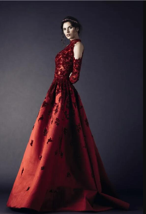 Red Evening Dresses Delicate Beaded High Neck Prom Dress Long Sleeves Floor Length Formal Evening Gowns