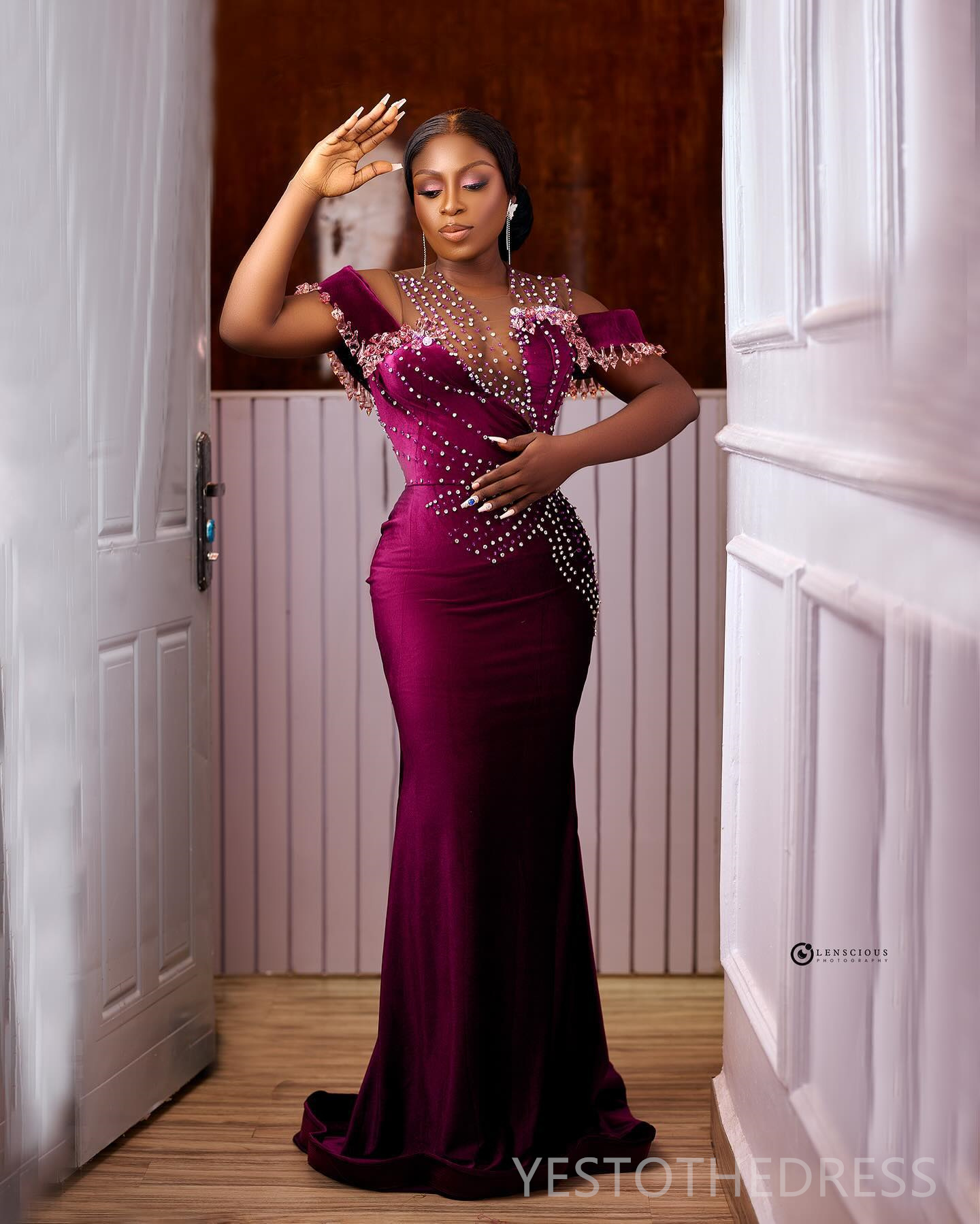 Classic Aso Ebi Prom Dresses for Special Occasions Illusion Promdress Bright Rustrose Velvet Beaded Tulle Crystals Decorated Birthday Reception