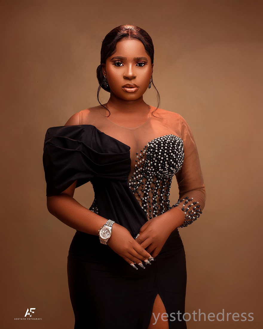 Prom Dresses Mermaid for Black Women Long Sleeves Elegant Evening Dress Illusion Beaded Side Split Birthday Party Dress
