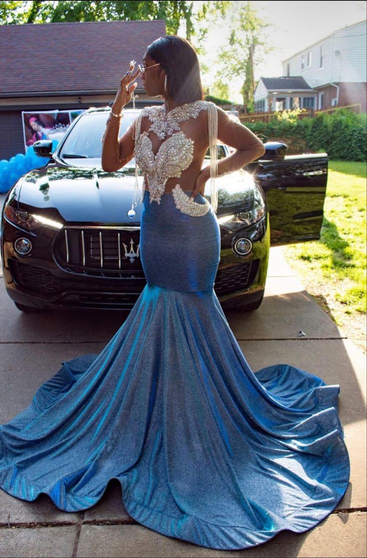 Blue Sheath Prom Dresses for African Women Beading Crystas Birthday Party Dress Evening Formal Dress