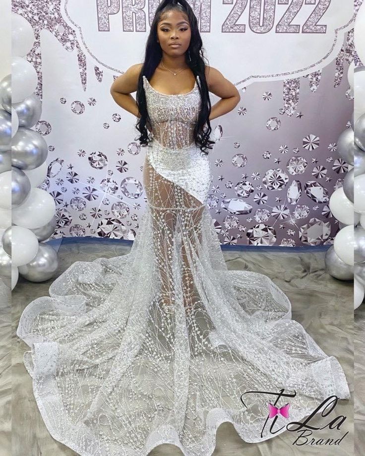 White Mermaid Prom Dresses for African Women Sequins Lace Birthday Party Dress Evening Formal Dress