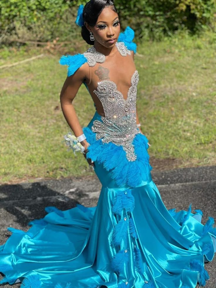 Sky Blue Mermaid Prom Dresses for African Women Beading Crystal Feathers Birthday Party Dress Evening Formal Dress