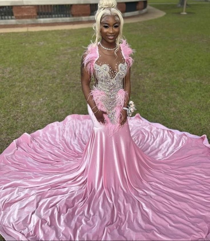 Pink Mermaid Prom Dresses for African Women Beading Crystals Feathers Birthday Party Dress Evening Formal Dress