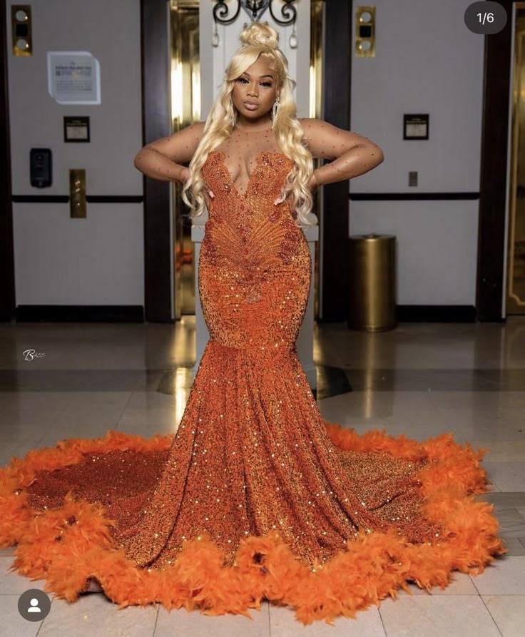 Orange Mermaid Prom Dresses for African Women Beading Crsytals Sequins Birthday Party Dress Evening Formal Dress