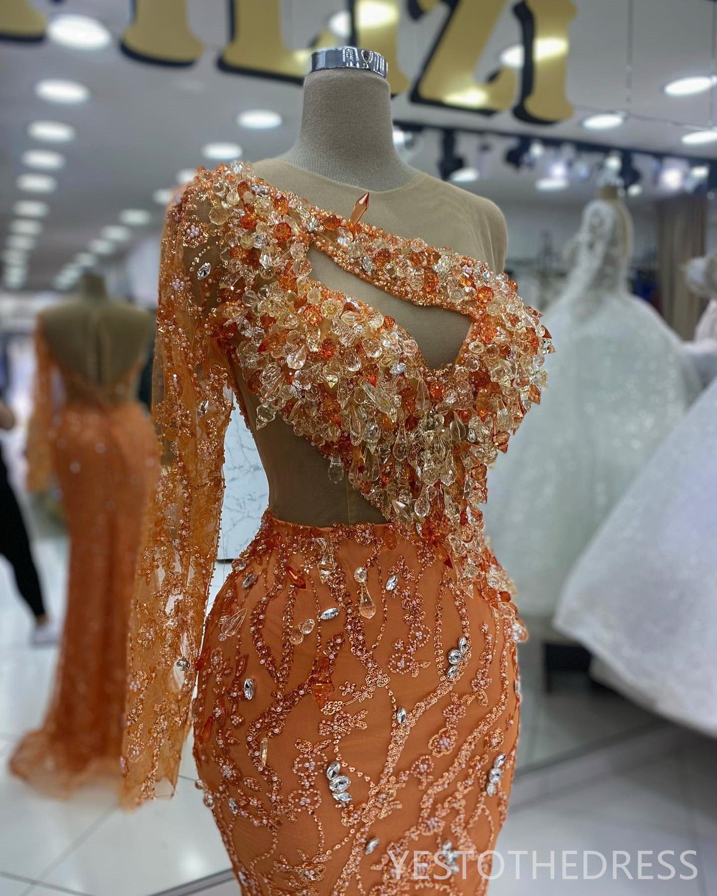 Orange Prom Dress Mermaid Illusion Evening Dresses Elegant One Shoulder Long Sleeves Beaded Lace Crystals Beading Rhinestones
