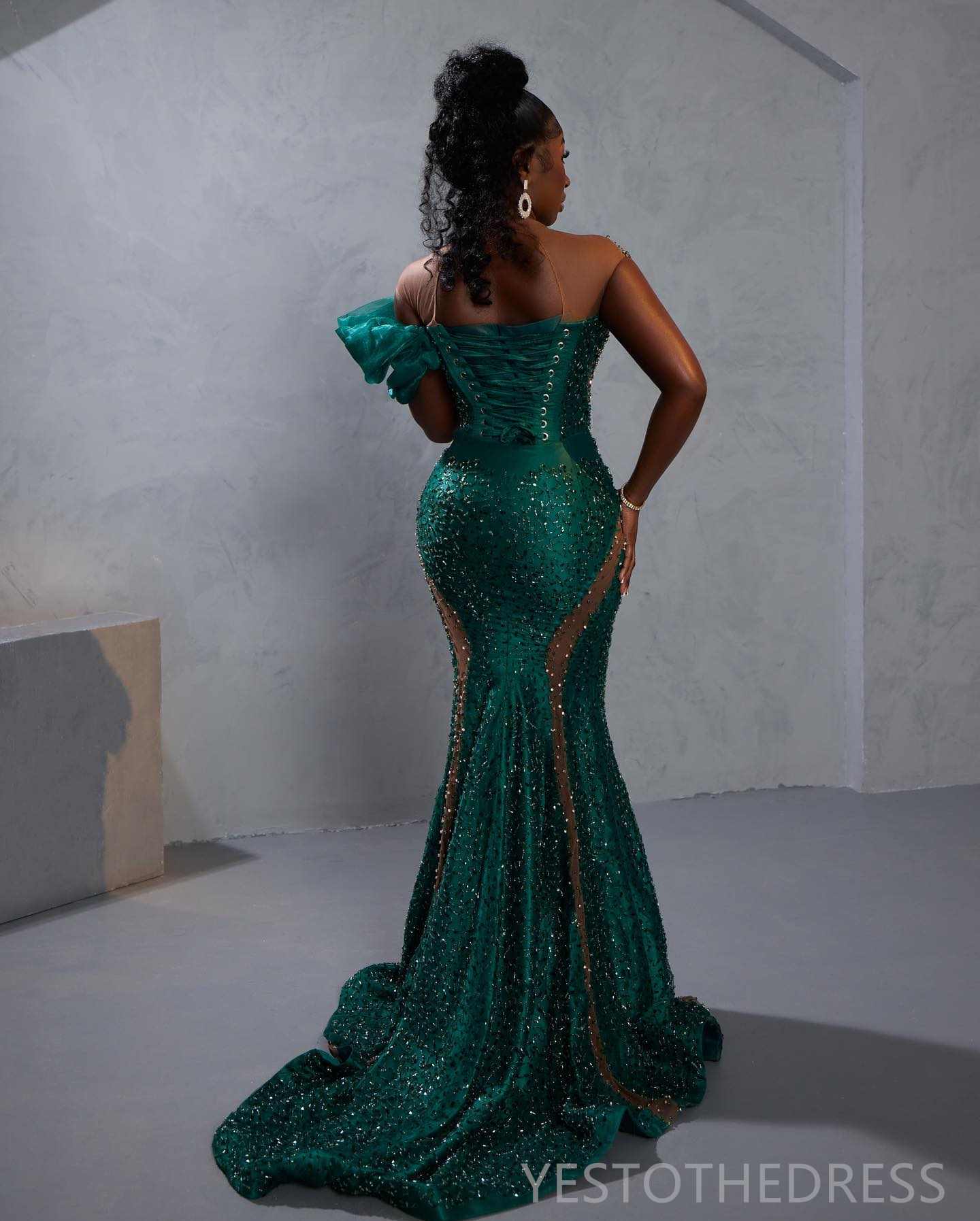 African Nigeria Plus Size Prom Dresses for Black Women Illusion Sheer Neck Mermaid Short Sleeves Sequined Lace Evening Dresses Formal Dress