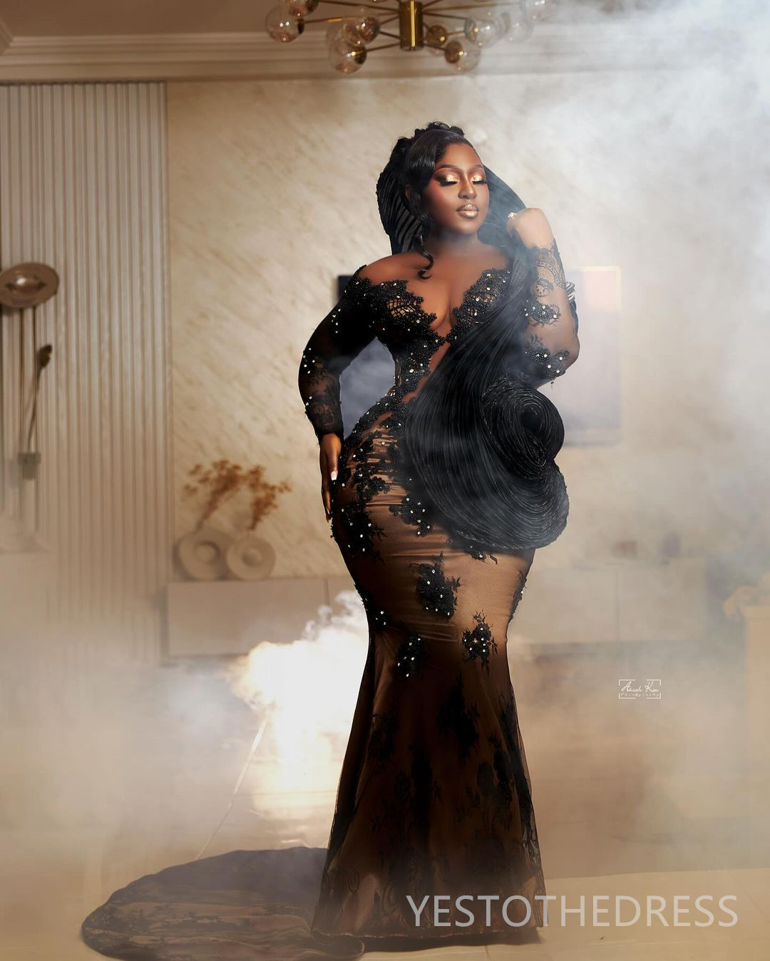 Black Mermaid Prom Dress Evening Dresses Elegant Sheer Neck Long Sleeves Beaded Lace Birthday Dress Second Reception Gowns