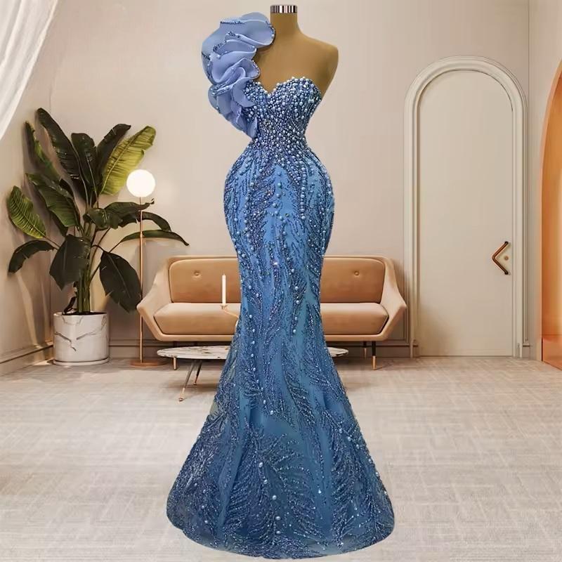 Sky Blue Prom Dress Mermaid Promdress One Shoulder Beaded Lace Flora Pearls Birthday Dress Second Reception Gowns For Special Occasions