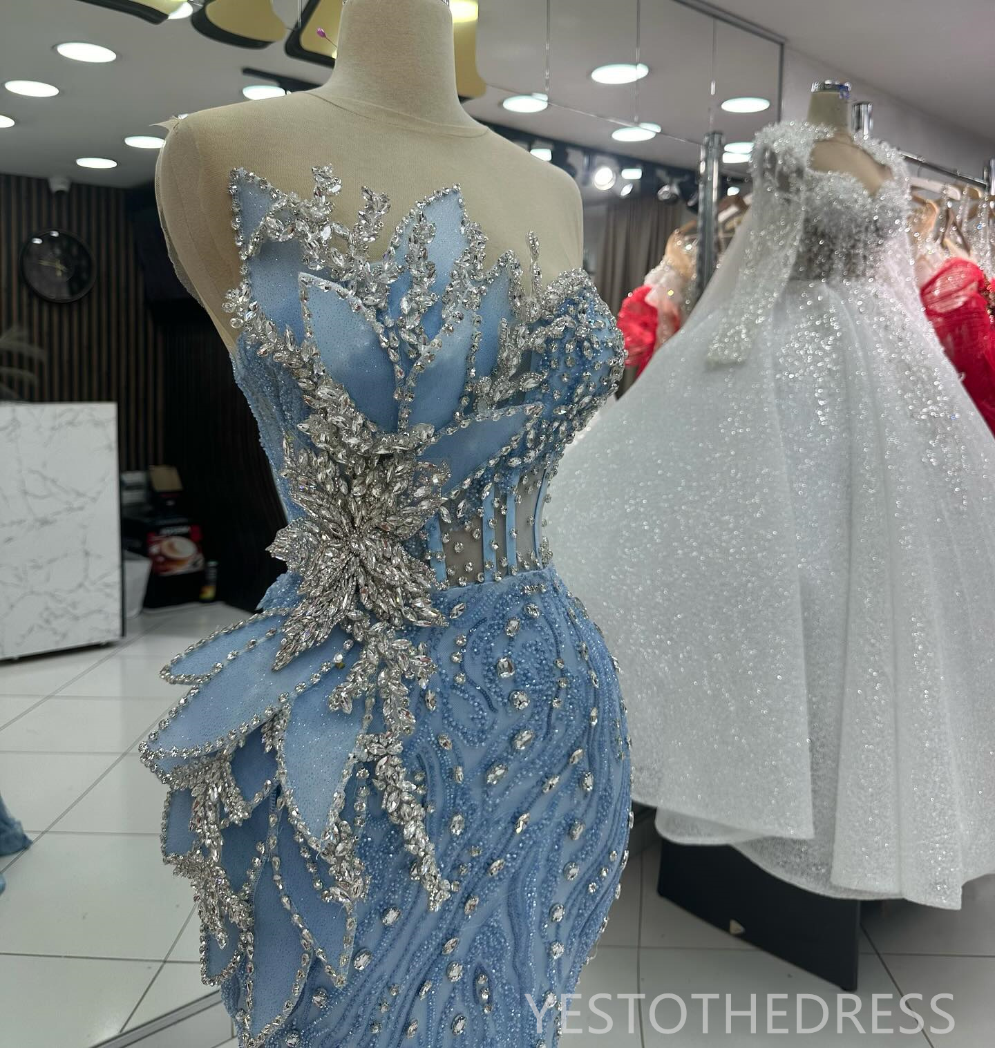 Sky Blue Prom Dress Evening Dresses Elegant Illusion Mermaid Promdress Beaded Lace Rhinestones Decorated Birthday Dress Reception Dress