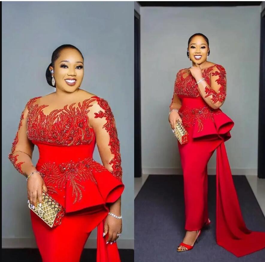 Red Evening Dresses Crystal Beading Long Sleeve Prom Gowns Party Wear African Fashion Second Reception Dress