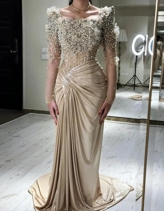 Elegant Champagne Mermaid Prom Dresses Beaded Long Sleeves Corset Evening Gowns 3D ral Appliques Ruched Formal Dress For Women