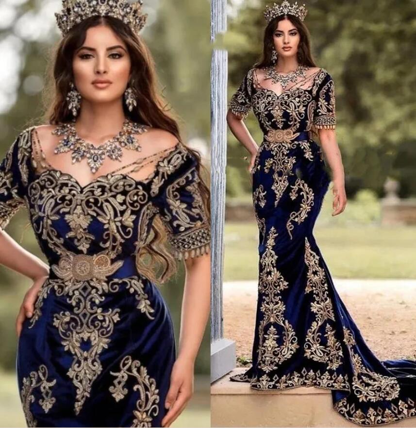 Vintage Arabic Kaftan Mermaid Evening Dresses Short Sleeves Gold Lace Appliques Beaded Long Navy Blue Velvet Celebrity Party Gowns Women