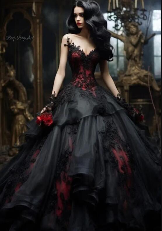 Black And Red Gothic Prom Dresses Ruffle Tiered Ball Gown Long Evening Gowns Lace Appliques Sweetheart Sleeveless Vintage Special Ocn Dress
