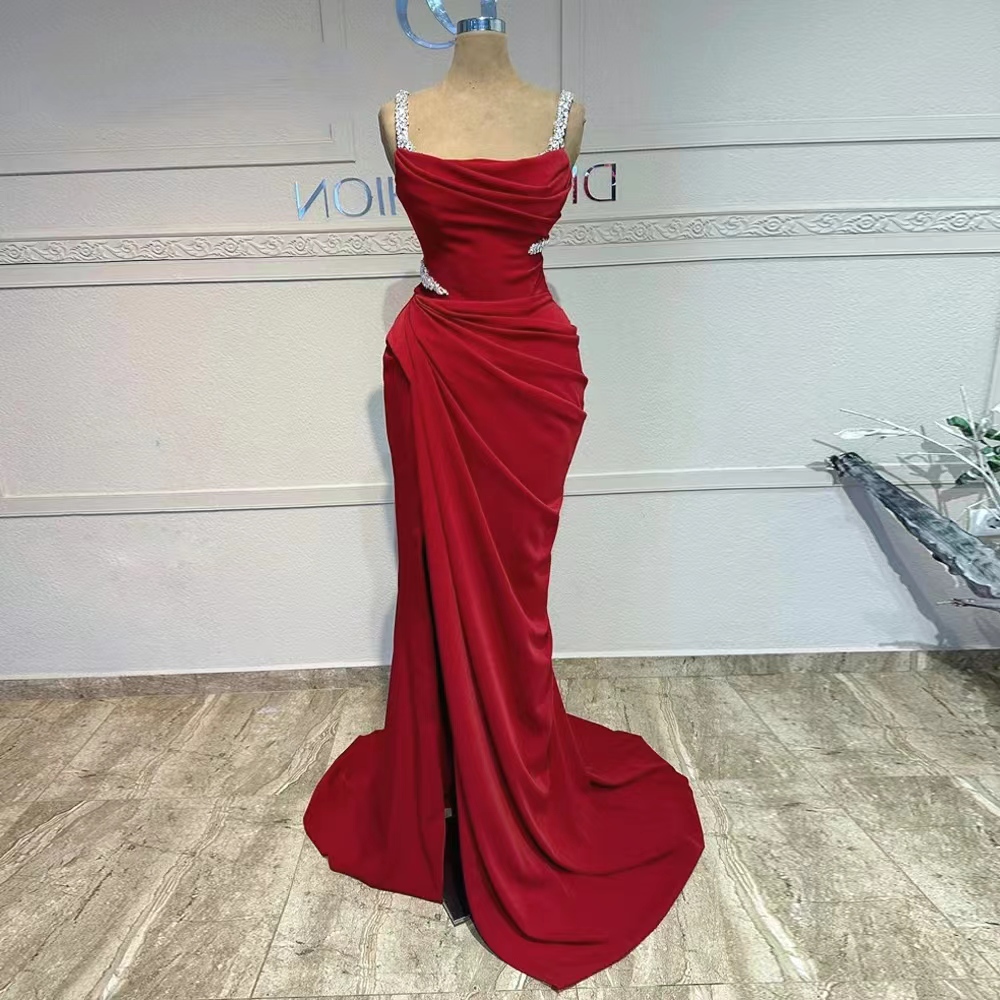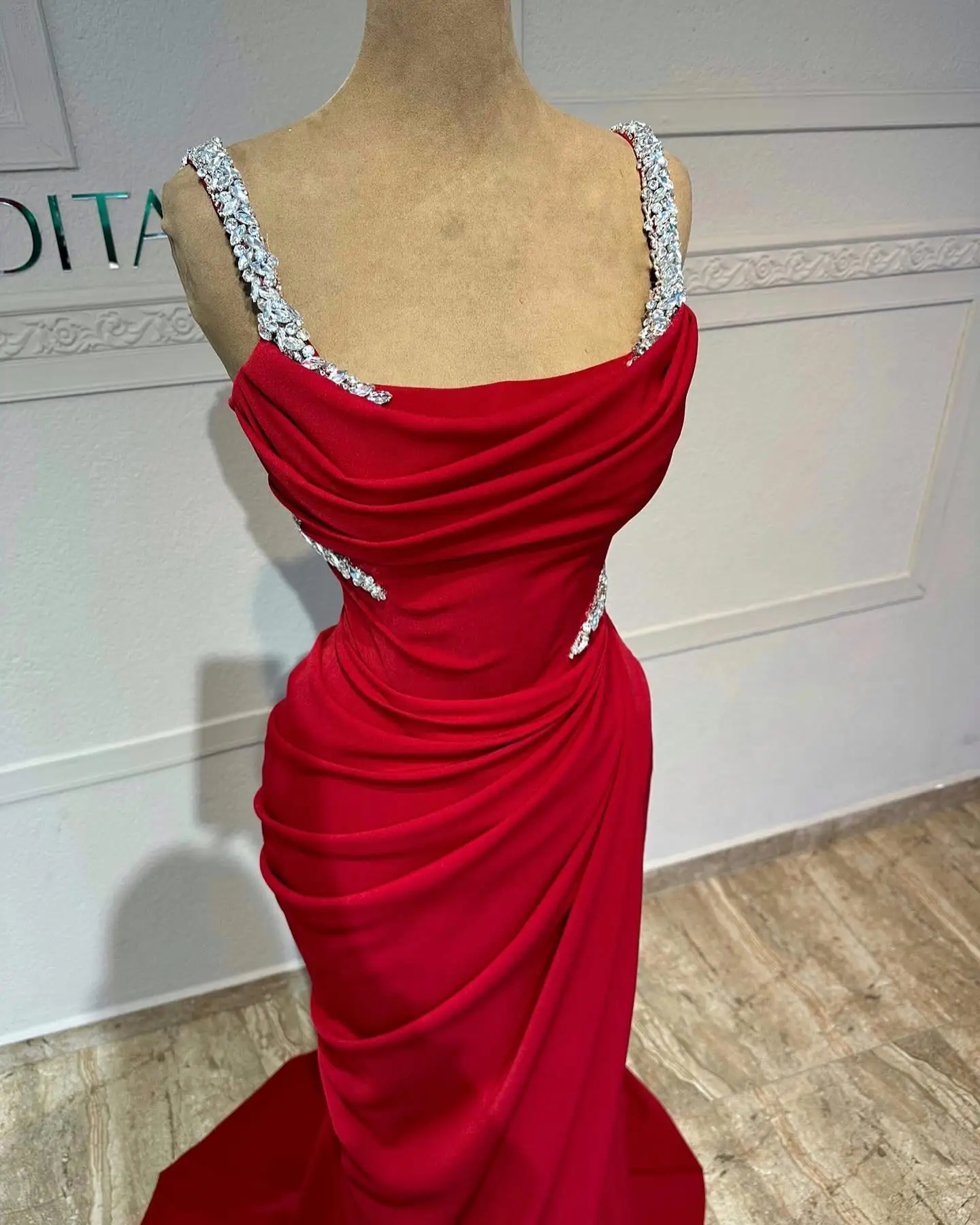 Simple Evening Dresses For Women Spaghetti Strap Sleeveless Gown Crystal Ruffles Sweep Train Dress Party Prom Custom Made