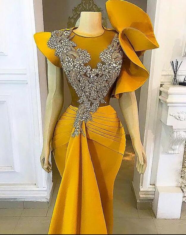 Plus Size Arabic Aso Ebi Yellow Mermaid Stylish Prom Dresses Lace Beaded Crystals Evening Formal Party Second Reception Bridesmaid Gowns Dress