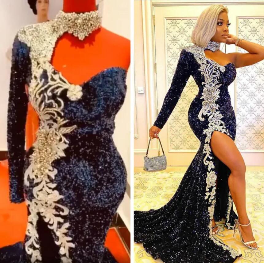 Navy Blue Sexy Evening Dresses Lace Beaded Mermaid Prom Dresses High Split Formal Party Second Reception Gowns