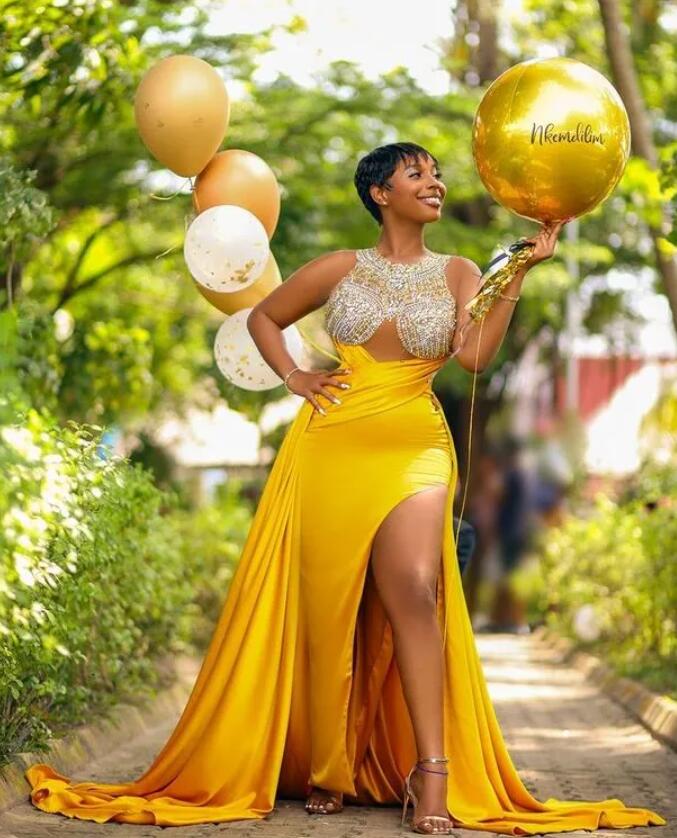 Yellow Luxurious Sexy Prom Dresses Beaded Crystals Evening Formal Party Second Reception Birthday Engagement Gowns Dress