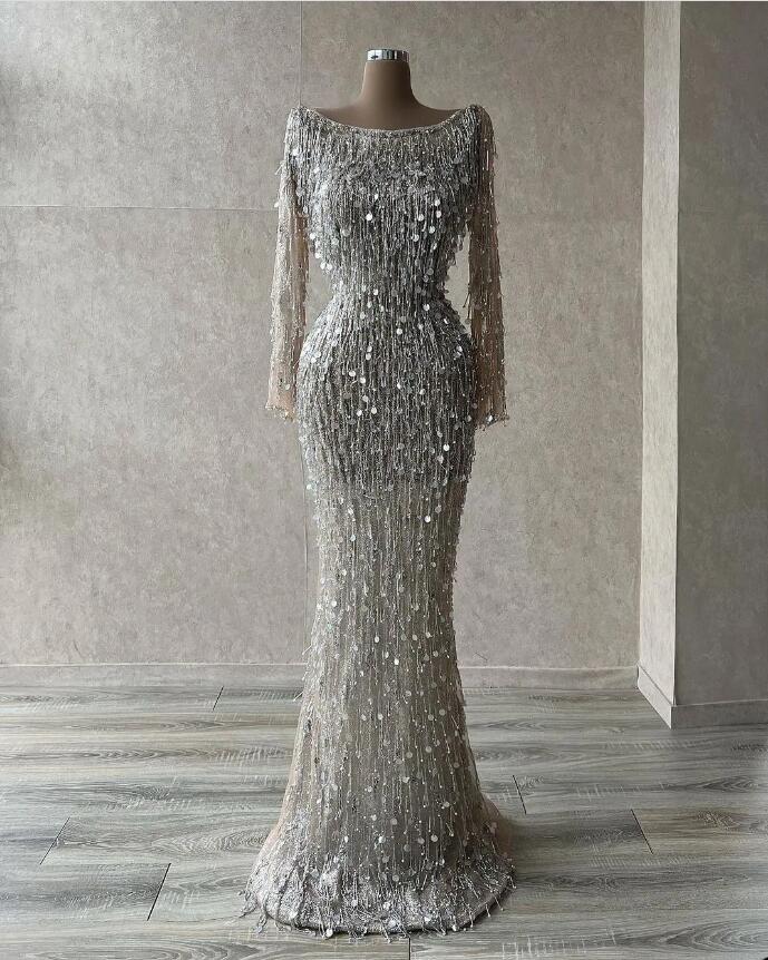 Luxury Mermaid Formal Prom Dresses With Jewel Long-sleeves Evening Dress Chic Tiered Party Gowns Custom Made Sequined Dress