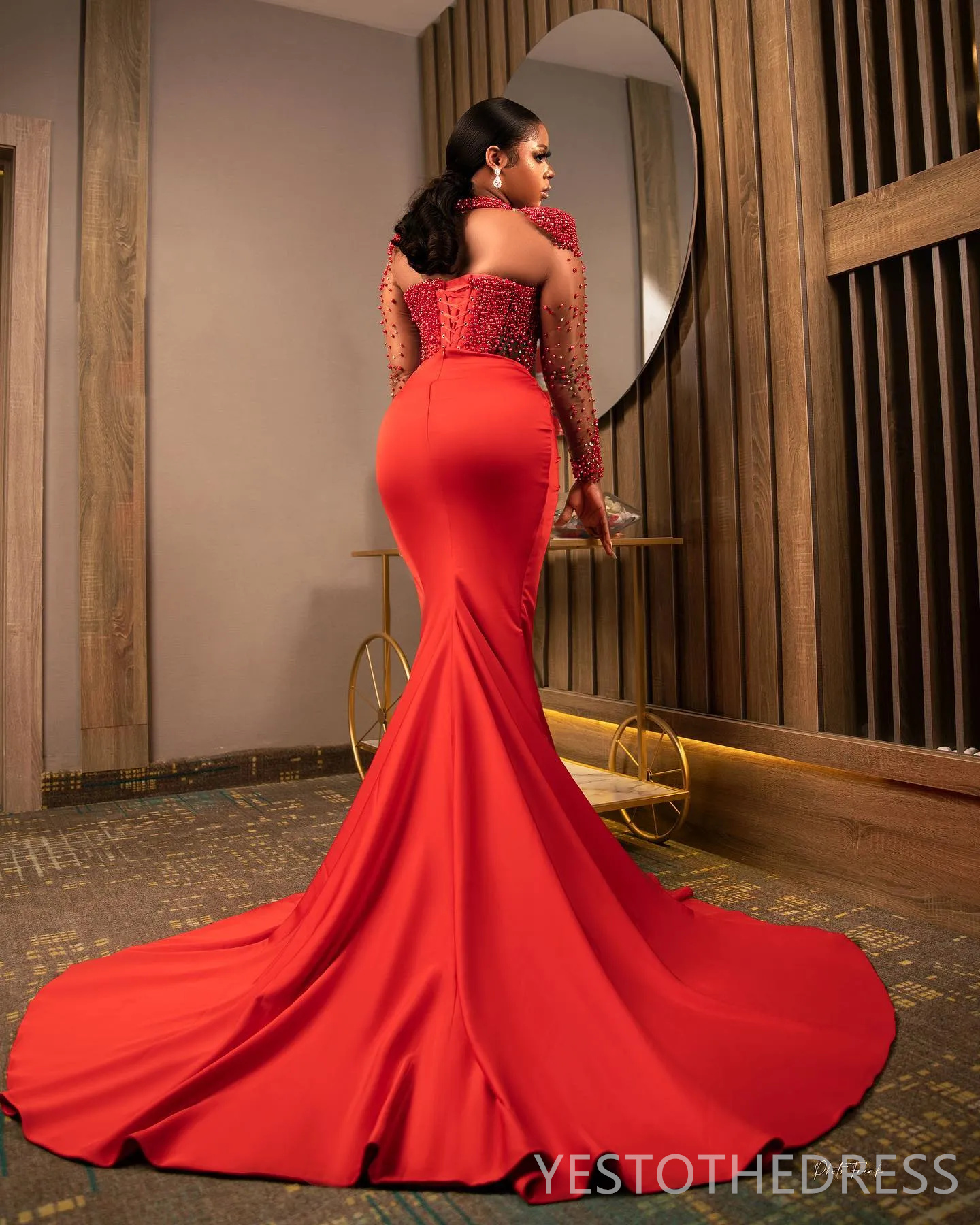 Plus Size Red Prom Dress Mermaid Evening Dresses Formal Gowns High Neck Long Sleeves Beaded Pearls Side Split 40TH Birthday Dress Second Dress