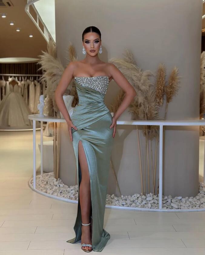 Elegant Green Prom Dresses Strapless Party Evening Dress Pleats Thigh Slit Formal Long Special Occasion Dress