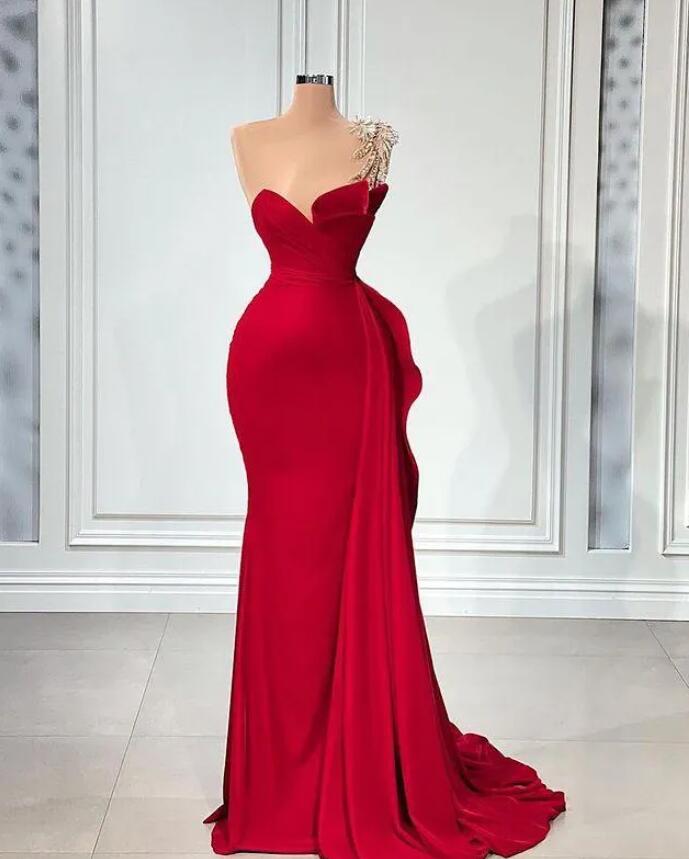 One Shoulder Mermaid Sexy Prom Dresses Arabic Aso Ebi Red Beaded Crystals Satin Evening Formal Party Second Reception Dress
