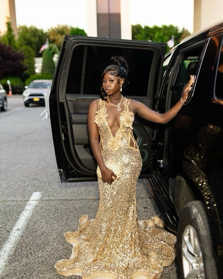 Gold Mermaid Prom Dresses Sequins Lace Beading Crystals African Girls Evening Gown Long Sleeve