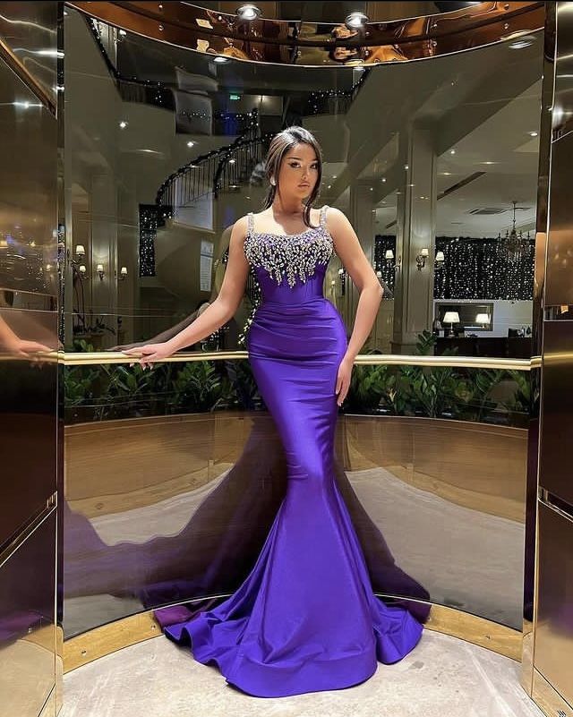 Purple Sheath Prom Dresses Beading Crystals Evening Gowns Formal Party Gowns