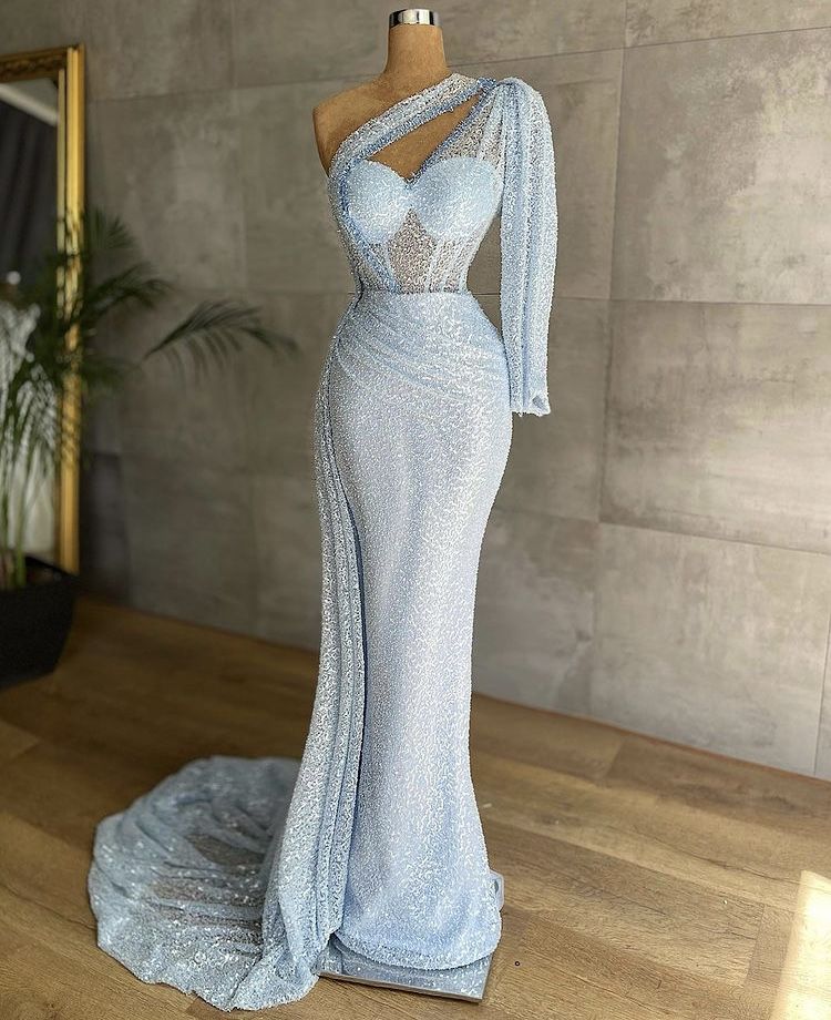 Luxury Mermaid Sequins Lace Sky Blue Prom Dresses Evening Gowns Formal Party Gowns