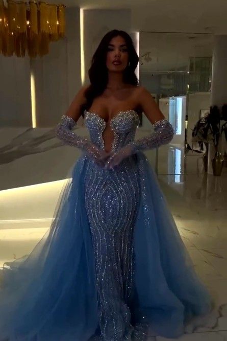 Blue Mermaid Sequins Lace Prom Dresses Evening Gowns Formal Party Gowns