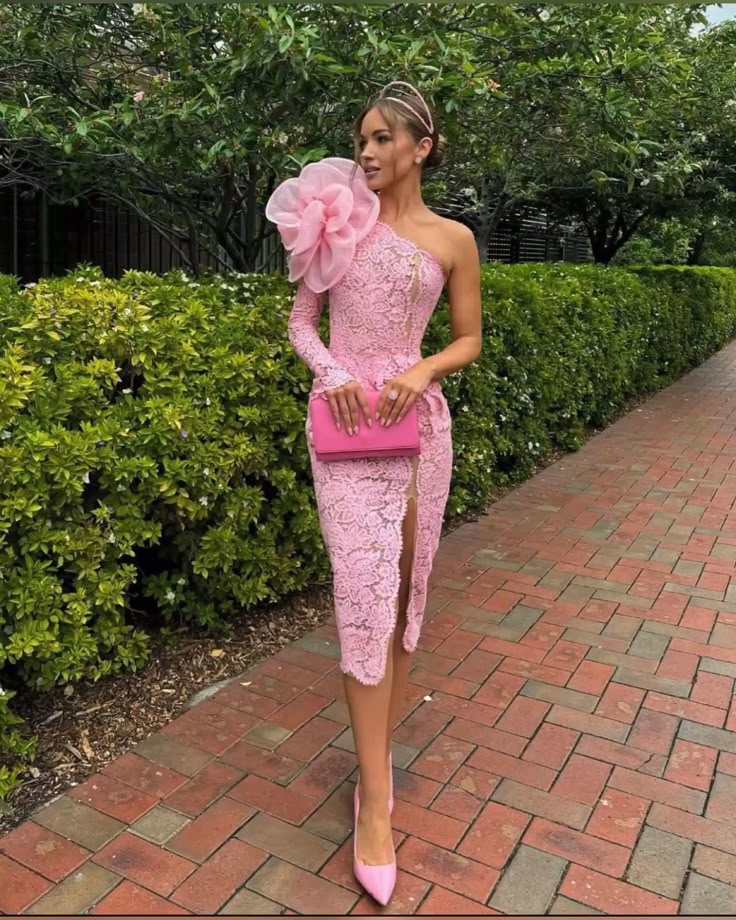 Pink Sheath 3D Handmade Flower Lace Prom Dresses Evening Gowns Formal Party Gowns