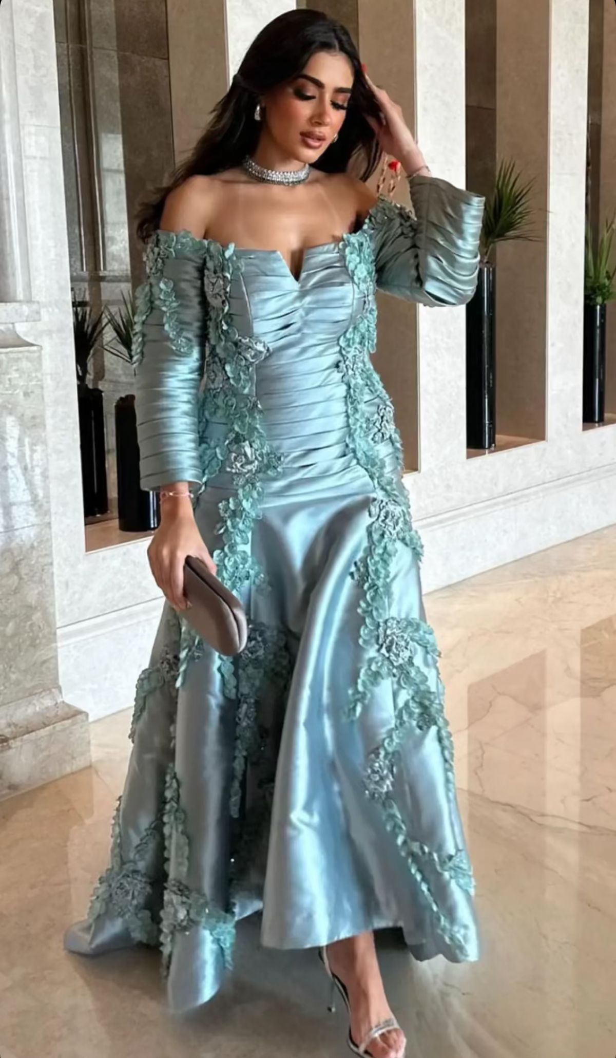 Elegant Blue Mermaid Handmade Flowers Floral Prom Dresses Evening Gowns Formal Party Gowns