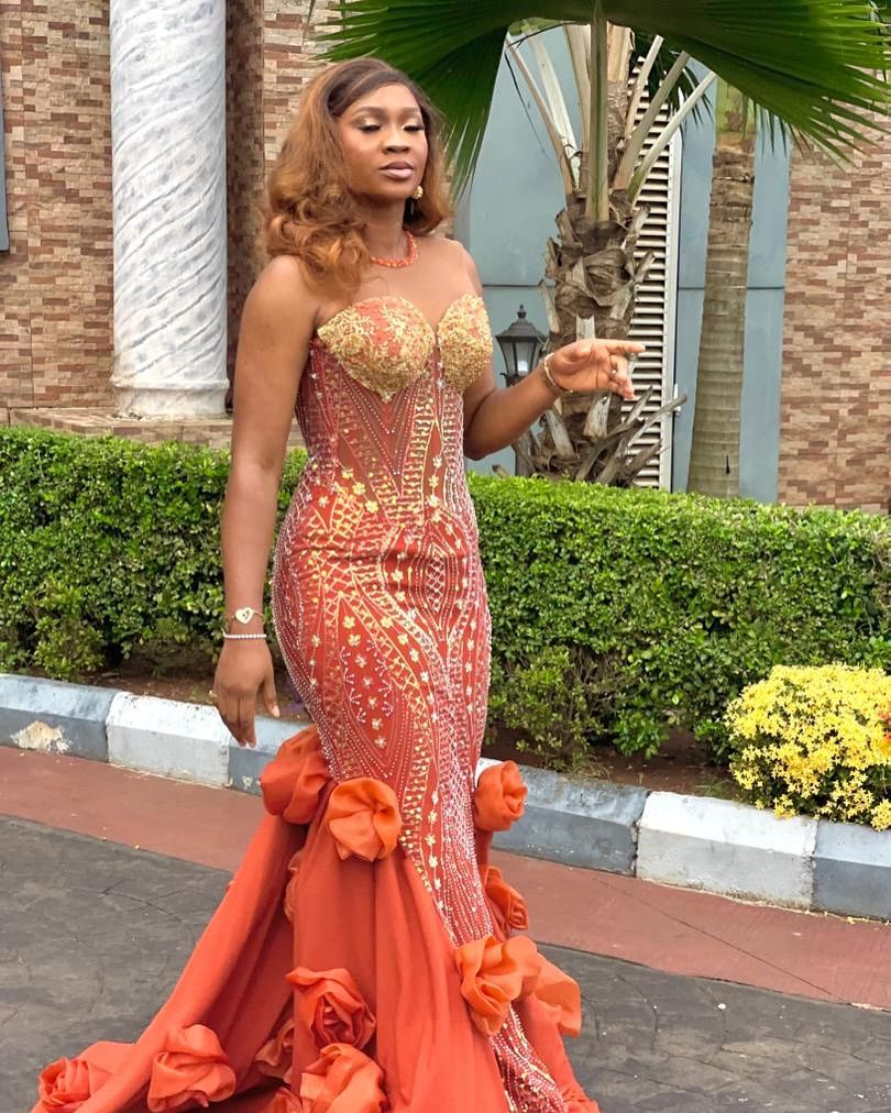 Elegant Orange Mermaid Beading Crystals Afrcian Girls Prom Dresses Evening Gowns Formal Party Gowns