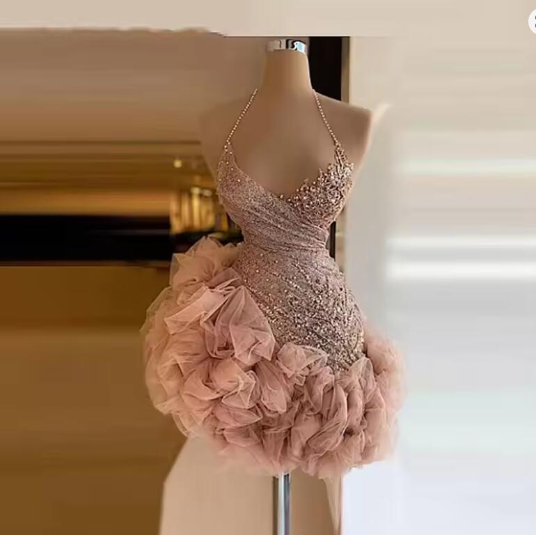 Dusty Pink Mini Homecoming Party Dresses Ruffles Sequins Short Prom Dress Halter Sexy Back Celebrity Cocktail Vestido de festa