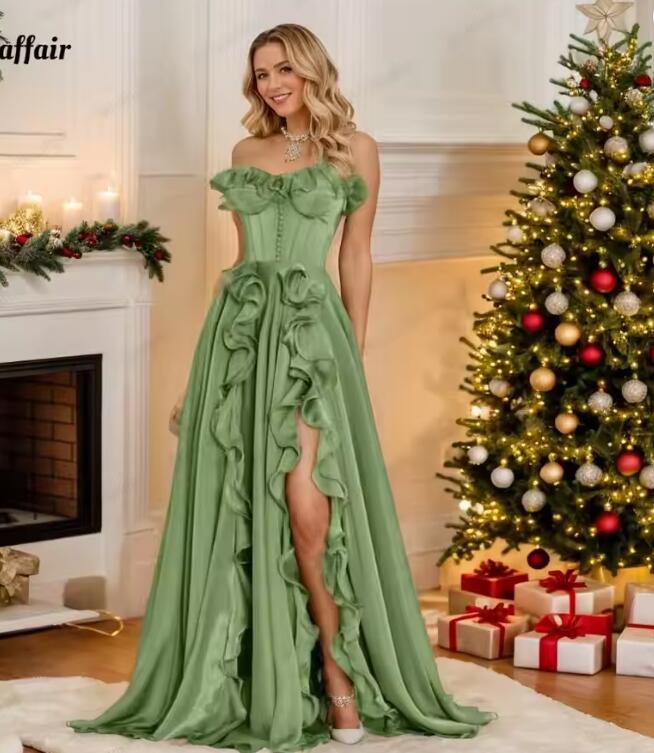 Elegant Women's Chiffon Prom Dress with Slit Long Ruffle Evening Formal Gown Sweetheart Sleeveless Party Dress