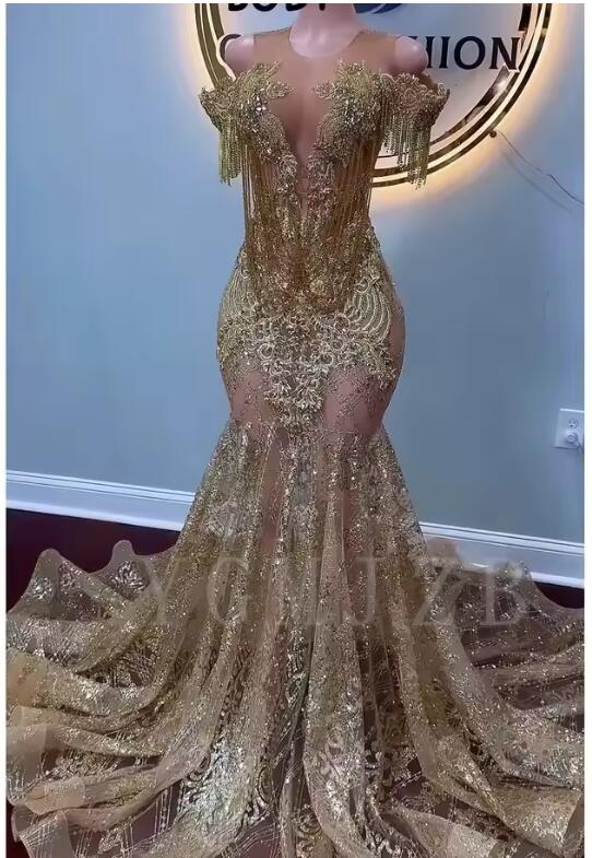 Glittle Gold Long Prom Dresses Luxury Off Shoulder Bead Rhinestones Tassels Formal Party Gala Graduation Gowns Customized