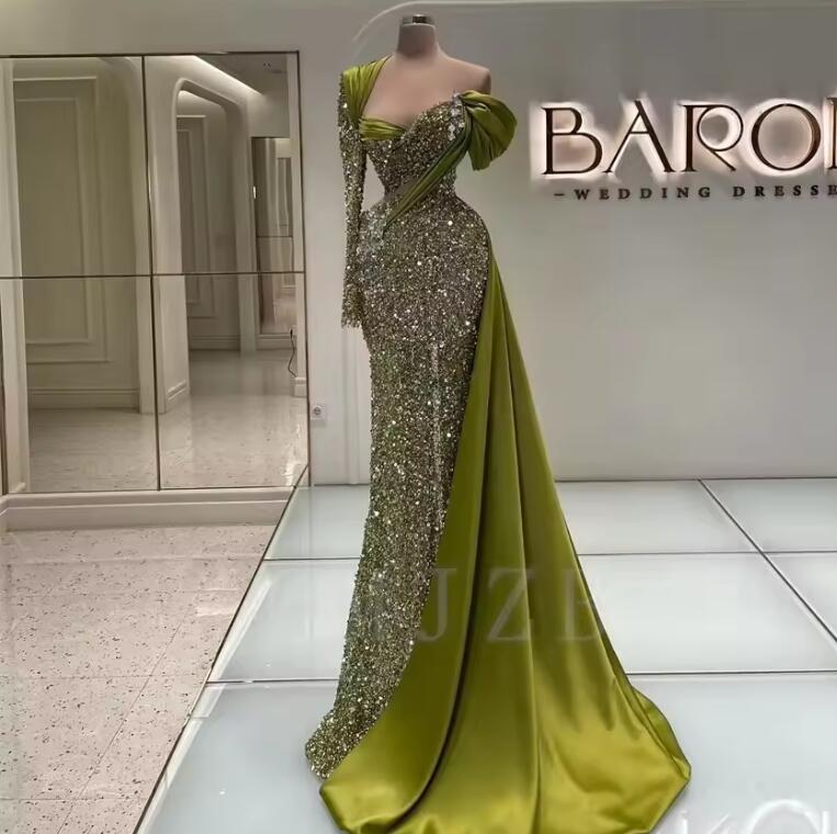 Green Sequin Saudi Evening Dresses Luxury One Shoulder Long Sleeve Formal Gowns Arabic Women Formal Prom Party Gowns Customized