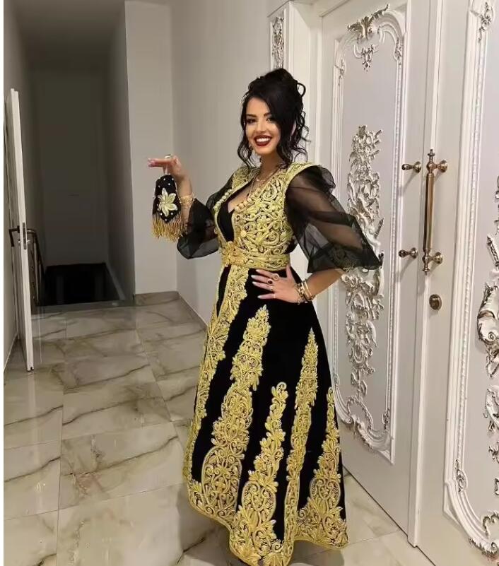 Customized Black Two Pieces Algerian Karakou Prom Dress for Women Gold Lace Applique Long Sleeve Evening Gown Traditional