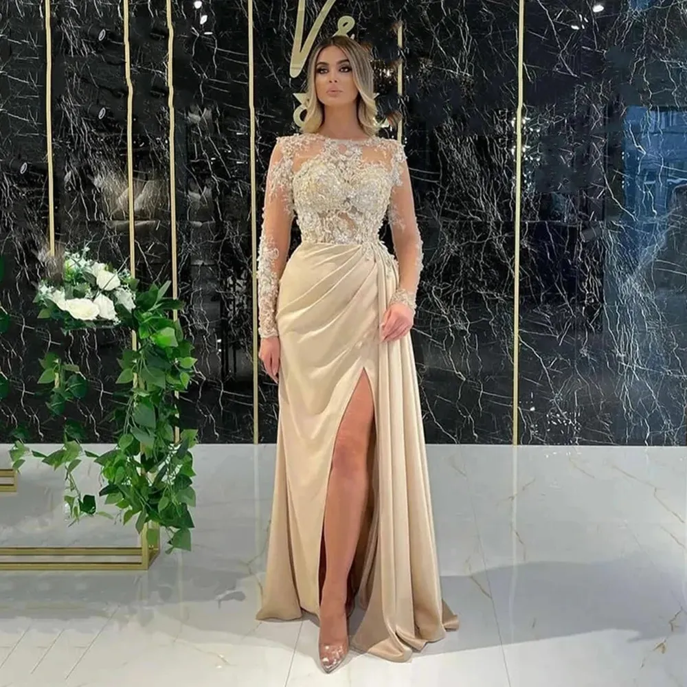 Champagne Pleated Evening Dresses Gorgeous Lace Applique Long Sleeve Mermaid Princess Prom Gowns With Side Split