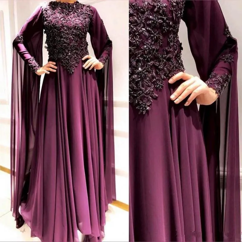 Modest Arabic Muslim Grape 3D Floral Appliques Evening Dresses Beaded Long Sleeves Prom Dress A-Line Formal Party Bridesmaid Pageant Gowns