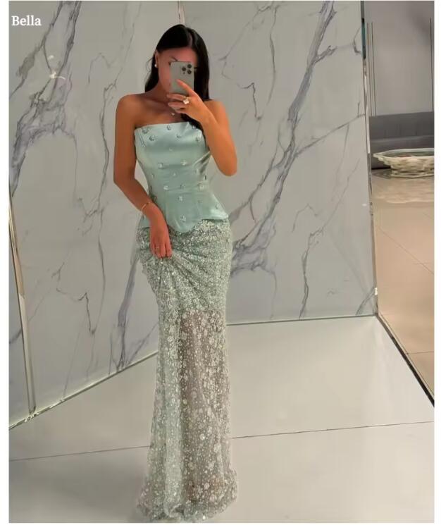 Customize Green Beaded Mermaid robes de soirée Strapless Sleeveless Prom Dresses Floor-Length Pearls Wedding Dress