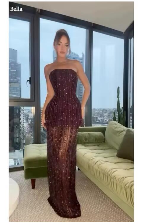 Customized Brown Sequins Lace robes de soirée Two-Piece Set Strapless Sleeveless Party Dresses Land-Length Prom Dress